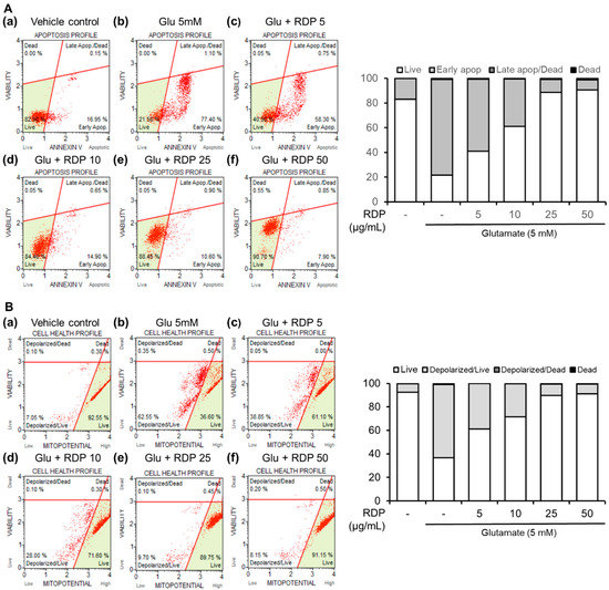 Next, we examined the preventative effect of RDP on oxidative stress-induced cell death in glutamate-treated HT-22 cells. ROS can react with cellular macromolecules through oxidative stress and cause the cells to undergo apoptosis [33]. As shown in Figure 4A, after treatment with glutamate alone, the HT-22 cells stained with annexin V, which detects early apoptotic cells, were noticeably increased to 77.4%, whereas 17.0% of the cells in the untreated control group were annexin V-positive. Co-treatment with glutamate and RDP markedly reduced this population of apoptotic cells. Moreover, the live cells were effectively recovered to 61.0%, 88.5, and 90.7% in HT-22 cells treated with RDP, respectively, which are dose-dependent. These results indicate that treatment with RDP inhibited oxidative stress-induced apoptotic cell death.