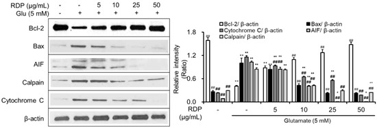In a previous report, we identified that elevations in ROS activated the signaling pathway related to apoptosis in hippocampus neuronal cells [9,12,17]. After we confirmed that RDP protected hippocampal neuronal cells against oxidative stress, we investigated the effect of RDP on the expression of apoptosis-related proteins in oxidative stress-exposed HT-22 neuronal cell line. RDP upregulated Bcl-2, an anti-apoptotic factor (Figure 5), whereas it downregulated the expression of pro-apoptotic factors such as Bax, AIF, calpain, and cytochrome C. These results suggest that RDP protected hippocampal neuronal cells against oxidative stress-induced apoptosis by mediating the expression of apoptosis-related proteins.