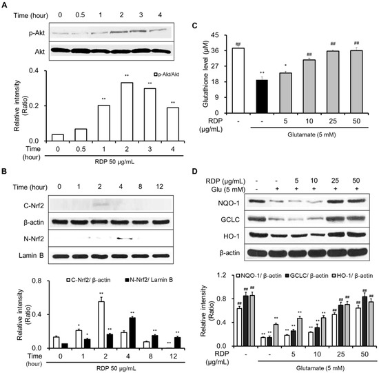 One mechanism for the neuroprotective effect of RDP is associated with the generation of antioxidant enzymes such as GSH, HO-1, NQO-1, and GCLC by activating the Akt/Nrf2/ARE pathway. The nuclear factor erythroid 2-related factor 2 (Nrf2) pathway plays a significant role in cellular reductive-oxidative homeostasis, and activation of this pathway is one of the main defense mechanisms against oxidative stress [41]. In support of this, RDP treatment caused the maximum expression of phosphorylation-Akt(p-Akt) at 2-3 h and translocation of the Nrf2 into the nucleus at 4 h. The p-Akt, which is an activated form of Akt, liberates Nrf2 from the keap1-Nrf2 complex, and then Nrf2 is combined into the ARE region on DNA sequence into the nucleus after Nrf2 translocation [17]. As a result, Nrf2 promotes the expression of antioxidant enzymes in the antioxidant defense system. In support of this, RDP attributes the expression of antioxidant enzymes.