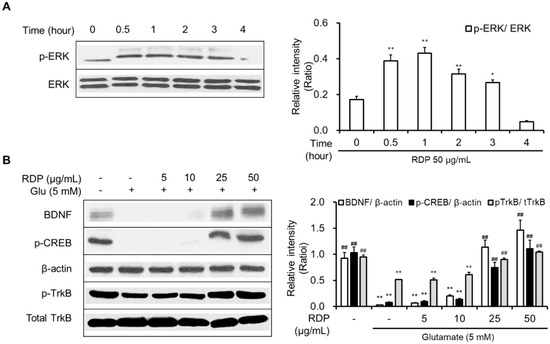 As shown in Figure 6A,B, RDP activated the phosphorylation of Akt and translocated cytosolic Nrf2 to the nucleus. RDP dose-dependently enhanced the expression of GSH, NQO-1, GCLC, and HO-1 in glutamate-treated HT-22 cells (Figure 6C,D). Furthermore, RDP also promoted the expression of BDNF, p-CREB, and p-TrkB by activating p-ERK (Figure 7). Treatment with RDP at 50 μg/mL significantly recovered the expression of these proteins compared to glutamate-alone-treated HT-22 cells. These results suggest that RDP exerted neuroprotective effects via the activation of both the Akt/Nrf2/ARE and ERK/BDNF/CREB pathways.