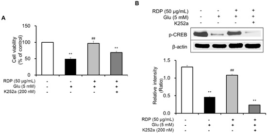 Subsequently, we clarified the mechanism by which RDP promoted activation of the ERK/BDNF/TrkB pathway in oxidative stress-induced HT-22 cells. To determine the action of RDP in the pathway, we investigated the suppressive effect of K252a, a TrkB inhibitor, in glutamate-treated HT-22 cells. After treatment with RDP, the cells were treated with K252a and pre-incubated prior to glutamate treatment. The addition of K252a significantly exacerbated the neuroprotective effects of RDP on oxidative stress-induced apoptosis in Figure 8A (p < 0.01). Further, the expression of p-CREB, as a transcription factor that mediates the expression of BDNF for the survival and differentiation of neuronal cells, was decreased by treatment with K252a when incubated in combination with glutamate and RDP in Figure 8B (p < 0.01). These results showed that RDP may affect the activation of BDNF/CREB/TrkB pathway.