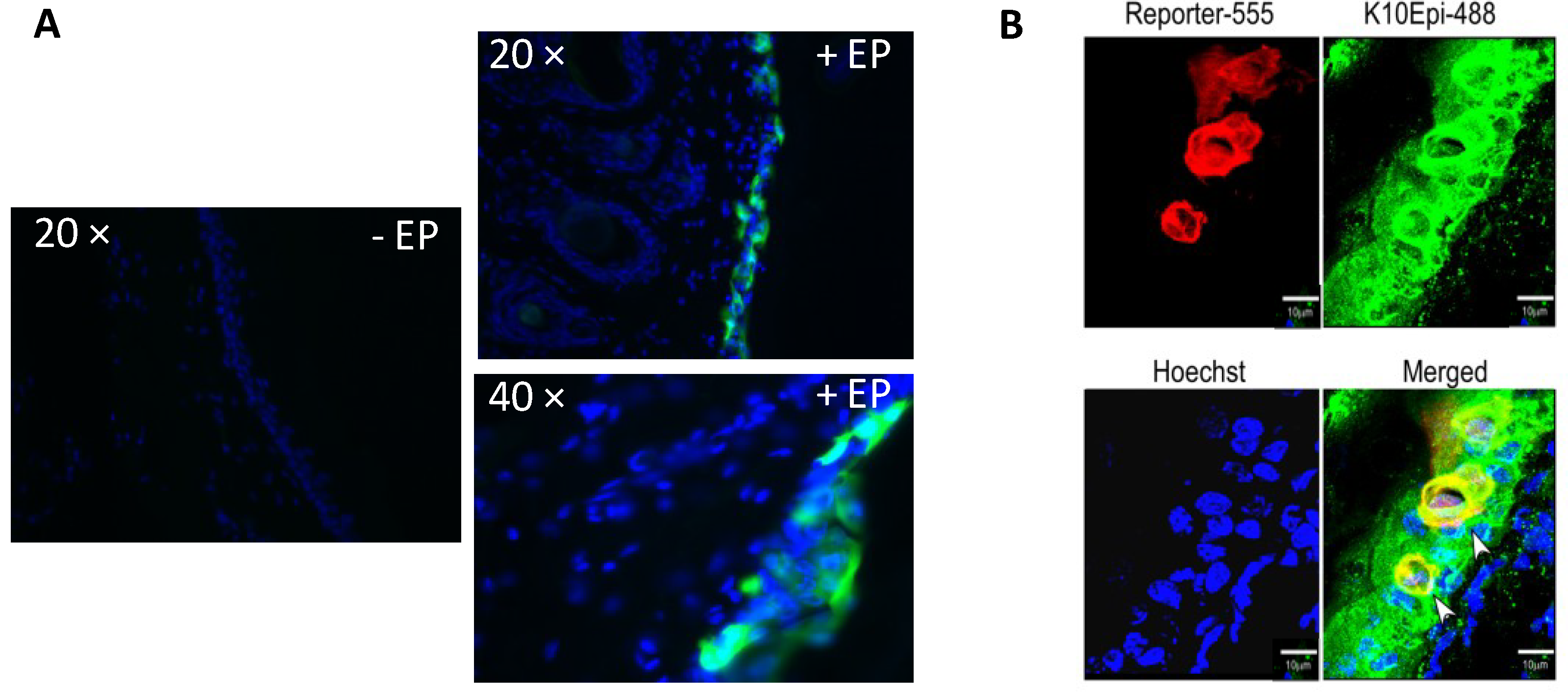 Figure 3. Histological analysis reveals reporter gene expression localized to cells in the epidermis. Histological analysis of GFP and red fluorescent protein (RFP) expression after ID plasmid administration followed by SEP in guinea pig skin. (A) GFP treated skin biopsies were removed 4 h post treatment, cryosectioned, DAPI stained and visualized using fluorescence microscopy (20× and 40×). An injection only control (no EP) is also shown; (B) RFP treated skin biopsies were removed, cryosectioned, stained with an antibody against K10 (a keratinocyte cell surface marker), Hoechst stained and visualized using confocal imaging.
