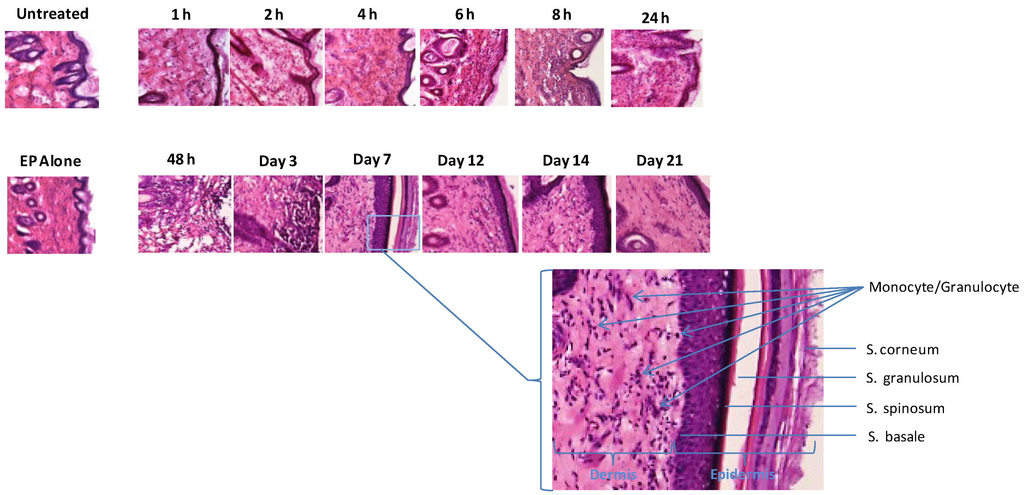 Figure 4. Rapid and persistent monocyte and granulocyte infiltration is detected at the treatment site following EP-enhanced plasmid delivery. Hematoxylin and eosin (H&E) stained histological analysis of skin sections following ID plasmid administration and EP with SEP in guinea pig skin in a time course. Skin biopsies were removed, cryosectioned, H&E stained and visualized under standard light microscopy (10×). An untreated control (no DNA, no EP) and EP alone post 1 h are also shown. A region of the day 7 time point section is enlarged to indicate skin structures and infiltration of monocyte and granulocyte.