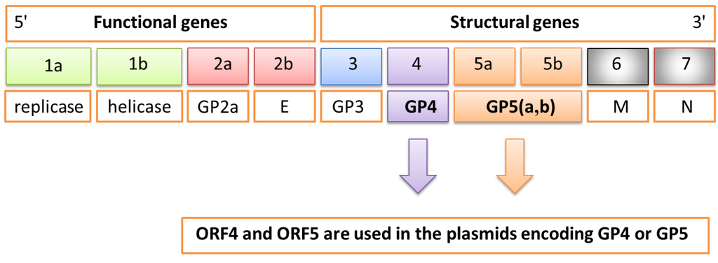 Schematic genome of porcine reproductive and respiratory syndrome virus (PRRSV) composed of 10 open reading frames (ORFs) encoding the different functional and structural proteins. In particular, ORF4 and ORF5 are used in the plasmid encoding GP4 or GP5 proteins.