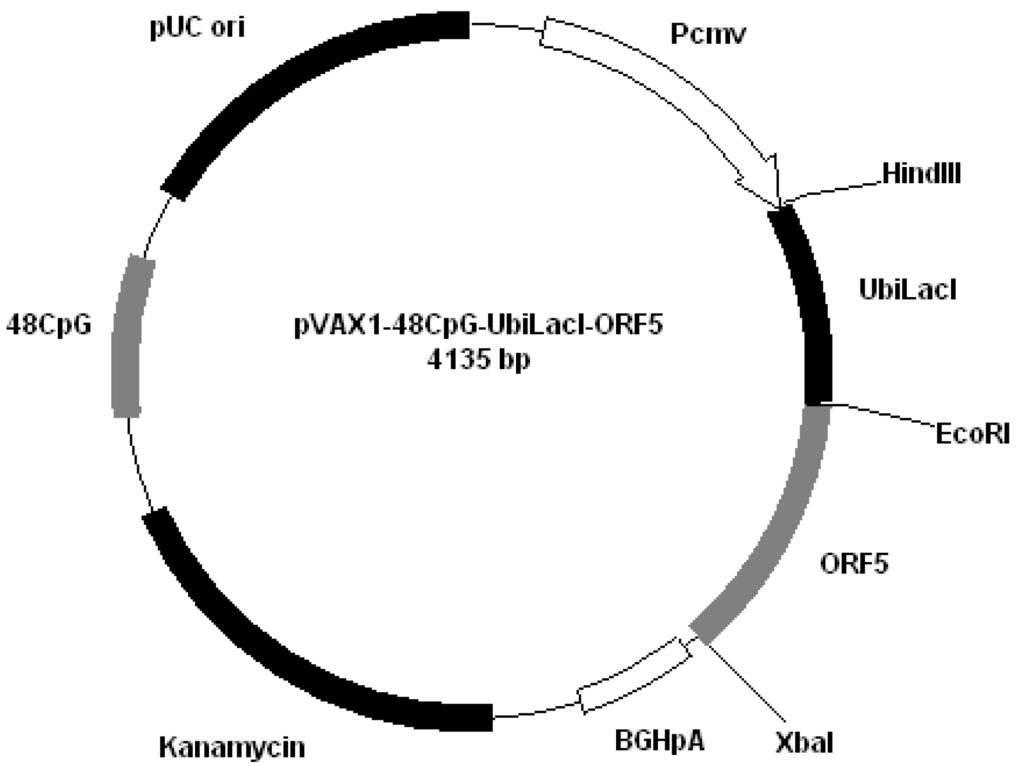 The experimental animals were divided into seven groups (Table 1). The pigs in the first four groups each composed of four animals, were injected with the vaccine by subcutaneously (s.c.) route in the retroauricolar region; the fifth and sixth groups were injected with the plasmid with 48-CpG or only plasmid; the animals in the seventh group served as controls. Group 1 received 500 µg of pVAX1-48CpG-NeuL-ORF4 plasmid in 500 μL of 0.1 M phosphate buffer saline, (PBS) (Vaccine A); Group 2 received 500 µg of pVAX1-48CpG-NeuL-ORF5 plasmid in 500 μL of 0.1M PBS (Vaccine B); Group 3 received 500 µg of pVAX1-48CpG-UbilacI-ORF4 plasmid in 500 μL of 0.1 M PBS (Vaccine C); Group 4 received 500 µg of pVAX1-48CpG-UbilacI-ORF5 plasmid in 500 μL of 0.1 M PBS (Vaccine D); Group 5 received 500 µg of pVAX1-48CpG plasmid in 500 μL of 0.1 M PBS (Vaccine E); Pigs in group 6 received 500 µg of pVAX1 in 500 μL of 0.1 M PBS. The animals in Group 7, were used as challenge infection controls. All animals were immunized three times, at 28-day intervals.