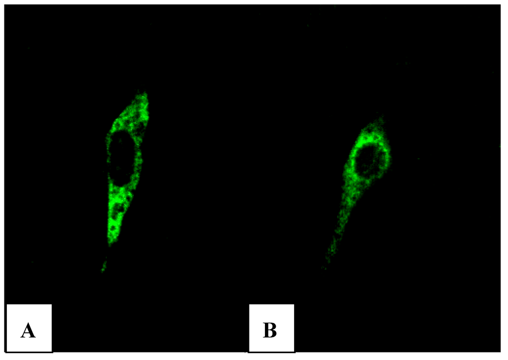 We cloned into the restriction site Xba I of pVAX1-48CpG-neuL-ORF4 and pVAX1-48CpG-neuL-ORF5 a sequence encoding for the antigenic Myc tag epitope EQKLISEEDL. This modification lead to the expression of ORF4 or ORF5 in fusion with the antigen Myc tag that is recognized by a commercial antibody FITC conjugated F2047 (Sigma-Aldrich, Milan, Italy) and then allowed us to follow the expression of ORF4 and ORF5 in mouse embryonic fibroblast cells (NIH-3T3) by confocal microscopy. Transfections of NIH-3T3 using a lipofectamine established protocol (Invitrogen, San Diego, USA) of either pVAX1-48CpG-NeuL-ORF4-Myc or pVAX1-48CpG-NeuL-ORF5-Myc led to a marked cytosolic expression of the encoded antigens (Figure 7A,B).