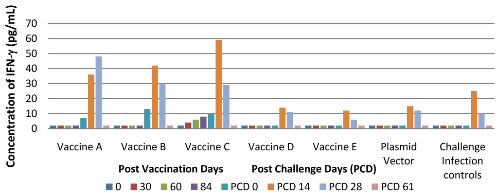 IFN-γ were detected only in the groups of pigs inoculated with vaccines B or C on PVD 84 with a mean titre of 13 and 10 pg/mL, respectively. A further increase was detected in these animals on PCD 14 when the mean was 41 and 59 pg/mL, respectively. In the other groups immunized with Vaccines A, D, E, plasmid vector and in the challenge infection controls, IFN-γ were detected only on PCD 14, with a mean titre ranging from 12–36 pg/mL. In all groups, a decreased of IFN-γ was detected on PCD 61 with a mean titres of 2 pg/mL (Figure 8).