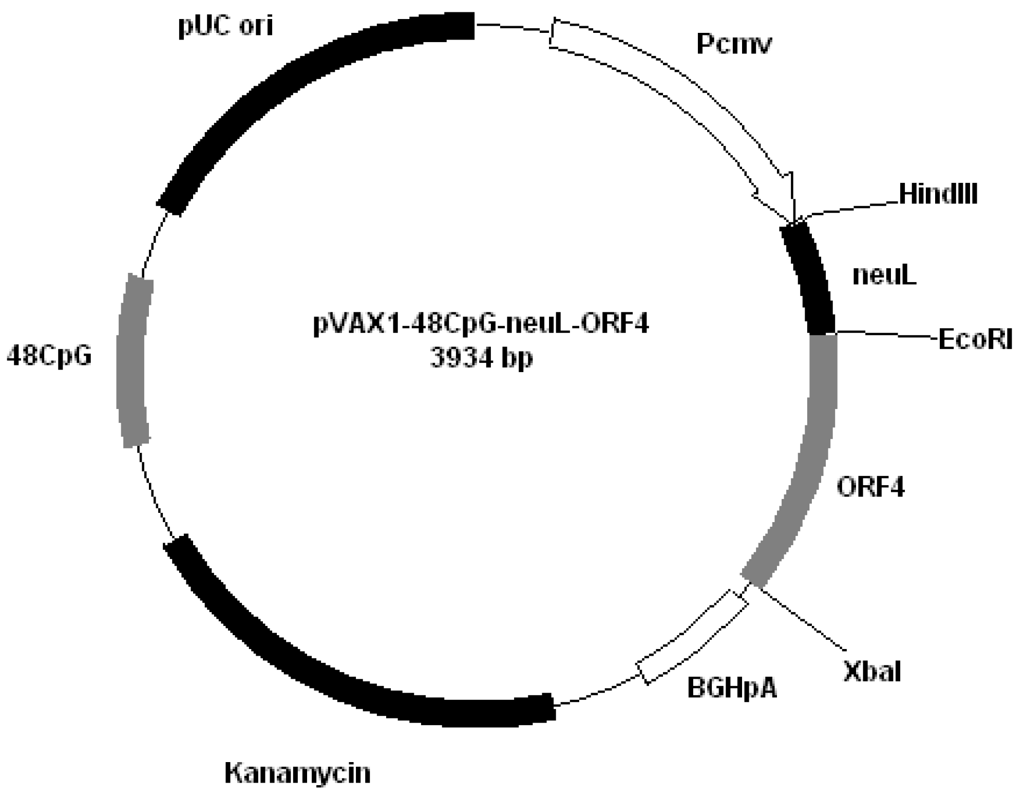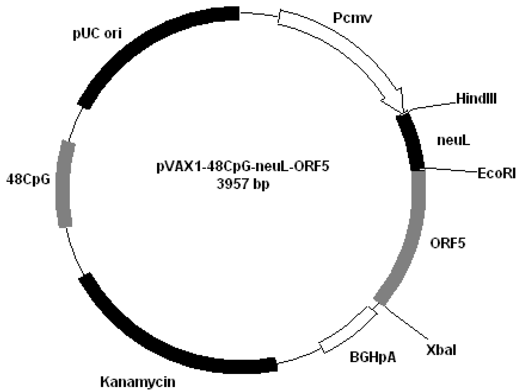 | 2 | 4 | B | pVAX1-48CpG-neuL-ORF5 | 500 µg/500 µL | 3 | s.c. |