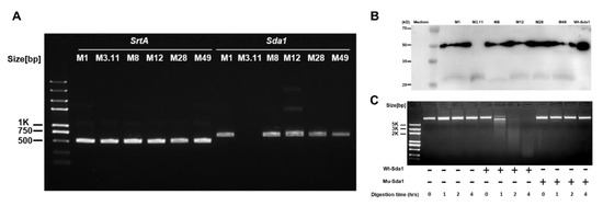 Invasive GAS disease is associated with acquired strains carrying prophages encoding DNase Sda1 [8,24]. The Sda1 gene was reported in 135 isolates of 141 emm12 GAS clinical strains from Hong Kong clinical isolates [25]. Blast search result indicates that the identity of Sda1 amino acid sequence is >77.64% with other strains, including GAS strains JRS4, RS4, MGAS8232, UTMEM-1, ATCC 10782, ATCC 10782, ATCC 10782, ATCC 10782, UTSW-2, UTSW-2, and MGAS2096. This finding indicates that Sda1 commonly presents in these bacteria. PCR assays were conducted to determine Sda1 prevalence in GAS among the clinical isolates collected in the laboratory. The results showed that SrtA, a conserved gene ubiquitously present in GAS, was detected in all six tested strains, and the Sda1 gene was found in five of these strains (serotypes M1, M8, M12, M28, and M49) but not in serotype M3.11 (Figure 1A). The same results at the Sda1 protein level were confirmed by Western blotting analysis (Figure 1B), indicating that Sda1 is commonly expressed in clinical GAS isolates. Recombinant Sda1 (Wt-Sda1) and enzymatically inactive Sda1 mutant (Mu-Sda1) were generated (Materials and Methods) [13,16] and their DNase activity was determined by plasmid DNA degradation assay. Wt-Sda1, but not Mu-Sda1, degraded plasmid DNA in a time-dependent manner (Figure 1C), indicating that the DNase activity of Mu-Sda1 was abolished.