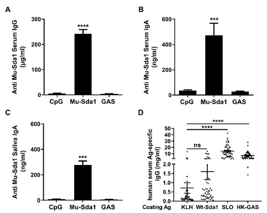 Antibody response to Sda1 in mice and humans. (A–C) Mice were immunized i.n. with Mu-Sda1 or adjuvant only or infected with GAS (Materials and Methods). Two weeks after the last immunization or infection, samples of serum and mouthwash were taken for antibody determination by ELISA. Levels of mouse serum IgG (A) and IgA (B), and IgA in mouthwash (C) directed to Mu-Sda1 are shown. Data are from two to three independent experiments (n = 9–12). (D) Antigen (Ag)-specific human serum IgG responses to indicated antigens (n = 49). Data are presented as the means ± SEM from two to three independent experiments. Statistical significance was determined by one-way ANOVA with Tukey’s post-test. *** p < 0.001; **** p < 0.0001; ns, not significant. Abbreviations: CpG, CpG-oligodeoxynucleotides; KLH, keyhole limpet hemocyanin; SLO, streptolysin O; HK-GAS, heat-killed GAS.