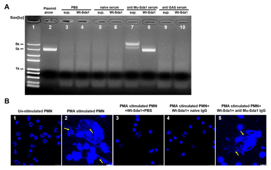 A collection of serum samples from immunized mice were tested for their ability to neutralize the DNase activity of Sda1 by plasmid degradation assay. A clinical isolate of GAS (M1) was grown in vitro to the stationary phase, and its culture supernatant was pre-incubated with or without anti-Sda1 sera. Next, plasmid DNA was added in the culture supernatant. The supernatant or Wt-Sda1 completely degraded plasmid DNA when incubated with PBS (Figure 3A, lanes 3 and 4) or with serum from naïve mice (Figure 3A, lanes 5 and 6). The digestion was prevented when the culture supernatant or Wt-Sda1 was pre-incubated with mouse anti-Sda1 serum (Figure 3A, lanes 7 and 8). The serum from GAS-infected mice did not rescue the digestion (Figure 3A, lanes 9 and 10), which is consistent with the lack of Sda1-specific antibody in these mice. Sda1 is a virulence factor that protects GAS against neutrophil killing by degrading NETs [11,13]. The NETs degradation assay with mouse neutrophils revealed that NETs appeared following a 4-h stimulation with PMA and disappeared following the addition of Wt-Sda1. NETs were still present after adding rabbit anti-Sda1 serum IgG-pretreated Wt-Sda1 (Figure 3B), indicating neutralizing activity of the antiserum.