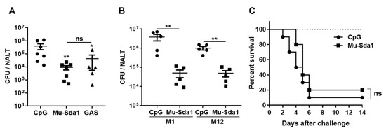 Immunization with Mu-Sda1 prevented GAS colonization in the nasopharynx. Mice were immunized as described in Figure 2. Two weeks after the last immunization, mice were challenged i.n. with GAS M1 (A). CFUs in NALT were determined 24 h after the challenge. (B) Immunized mice were challenged with GAS M1 or GAS M12, respectively. CFUs in NALT were determined 24 h after the challenge. (C) Two weeks after the last immunization, mice were i.n. challenged with a lethal dose of GAS M1 (3 × 108). The mortality of mice was recorded for 14 days (n = 20–21). Data are from two independent experiments. Statistical significance was determined by one-way ANOVA with Tukey’s post-test (A) or two-tailed unpaired Mann–Whitney U nonparametric t-test (B) or log-rank test (C). * p < 0.05; ** p < 0.01; ns, not significant.