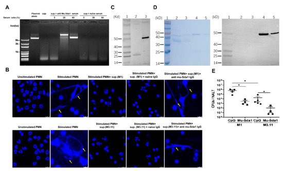 Anti-Sda1 prevented NETs degradation and mucosal infection by Sda1-negative M3.11 strain. (A) Sda1 immunized serum neutralized nuclease activity in GAS M3.11 culture supernatants in the plasmid degradation assay. (B) Anti-Sda1 serum cross-neutralized DNases expressed in the GAS M1 and M3.11 culture supernatant. Isolated mouse neutrophils were stimulated and stained with DAPI as described in Figure 3. Diluted GAS M1 and M3.11 culture supernatant were pre-incubated with rabbit immunized serum IgG before incubation with neutrophil NETs. Representative images are shown. Scale bar, 10 μm. (A,B) Experiments were performed in triplicate. (C) Recombinant DNase B was analyzed by SDS-PAGE and Western blotting with anti-Sda1 serum. Lane 1, Mw; lane 2, recombinant DNase B; lane 3, recombinant Sda1. (D) Recombinant Homo sapien DNase I was analyzed by SDS-PAGE and Western blotting with anti-Sda1 serum. Left panel: SDS-PAGE, right panel: Western blot. Lane 1, Mw; lane 2, recombinant DNase I (300 ng); lane 3, recombinant DNase I (100 ng); lane 4, recombinant Sda1 (300 ng); lane 5, Recombinant Sda1 (100 ng). (E) Mice were immunized as described in Figure 2. Two weeks after the last immunization, mice were i.n. challenged with GAS M1 or M3.11 strain, respectively. CFU in NALT were determined 24 h after challenge. (n = 5). Statistical significance was determined by two-tailed unpaired Mann–Whitney U nonparametric t-test (D). * p < 0.05. Abbreviations: Mw, molecular weight.