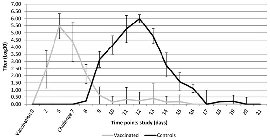 Animals were MDA-negative at the start of the study and at the time of challenge were still seronegative (Table 1). Animals only seroconverted 14 days after challenge and average group titers went up to 7.3 log2 in the vaccinated-challenged group and up to 4.9 log2 in the nonvaccinated-challenged group.