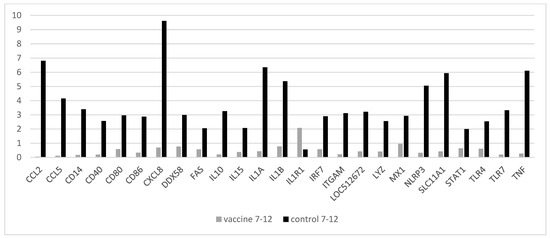 Figure 4 shows the overall Ct fold-changes of genes that showed a significant increase in both groups five days after challenge (day 12) in comparison to day 7. Interestingly, five days after challenge the values in the group that were vaccinated and challenged were almost all back to normal levels or lower as measured before vaccination, except IL1R1, which showed a 2.1-fold increase.
