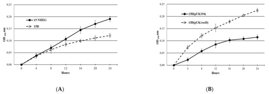 F. tularensis growth in BHI broth at 37 °C, strains: (A)—15D and 15 NIIEG; (B)—15D (pUK/recD) and 15D (pUK194).