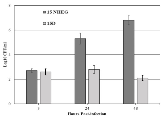 recD gene deletion in strain 15 NIIEG led to a slowdown in bacterial growth on solid and liquid nutrient media, as well as to a slowdown in reproduction in J774.1A macrophage-like cells. The observed decrease in the replication of strain 15D in macrophages can probably be explained by its reduced ability to grow in the BHI medium, which mimics the growth conditions in macrophages [29,30,31]. This effect may have led to a significant decrease in the virulence of the modified F. tularensis 15D strain. Influence of the recD gene on bacterial growth was previously demonstrated for Pseudomonas syringae Lz4W [32].