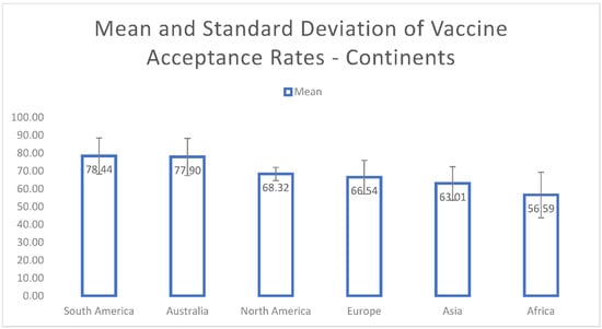 Figure 4. Mean and standard deviation of COVID-19 vaccine-acceptance rates for continents.