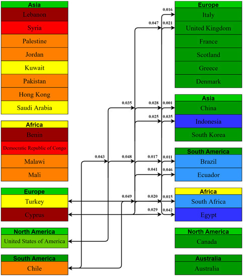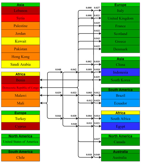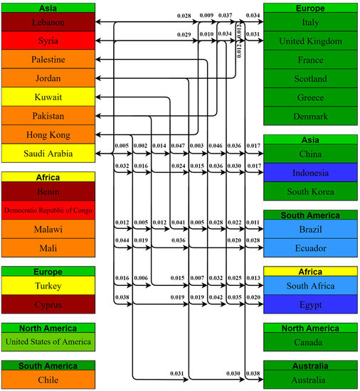 African countries with lower acceptance rates had statistically significant comparisons with 31 countries; 8 comparisons were with European countries, 7 with other Asian countries, 7 with other African countries, and 6 with South American countries. Democratic Republic of Congo had the most comparisons, i.e., 15, with a value of p < 0.05, which is the highest among the included countries.