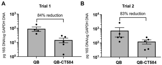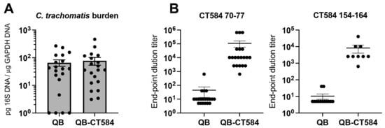 Prior to the proven success of the VLP HPV vaccines, it was unclear whether antibody would be effective against HPV since it did not contribute to protection during natural infection []. Similarly, antibody elicited by natural infection has been shown to be dispensable during the clearance of primary upper genital tract infection with C. trachomatis in mice [] and in women does not correlate with re-infection outcomes []. Yet, others have shown that protective antibody responses superior to those from natural infection can be achieved exogenously through monoclonal antibody treatments or experimental vaccines, as with the HPV vaccines [,,,]. Our data add to this line of evidence by demonstrating that pre-incubation with high-titer Qβ-CT584 immune serum is sufficient to reduce C. trachomatis burden in the upper genital tract. Antibody could reduce bacterial burden by neutralizing the bacteria (i.e., hindering attachment or virulence factor function) or through enhancing opsonophagocytic clearance of the bacteria. The use of an in vivo protection assay (in Figure 6) instead of an in vitro neutralization assay allows us to be inclusive of both effector functions, which could be teased apart in further mechanistic studies. Antibody may also impact time-to-clearance which could be assessed in future time course analyses using C. trachomatis or the C. muridarum vaginal infection model.