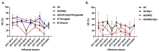The vaccine effectiveness (VE) against laboratory-confirmed influenza from 2011–2020 in the US by (A) strains and (B) age against A(H3N2). Data represents the pooled estimates, and error bars represent 95% confidence intervals. Data was obtained from www.cdc.gov/flu/vaccines-work/, (accessed on 12 November 2021).