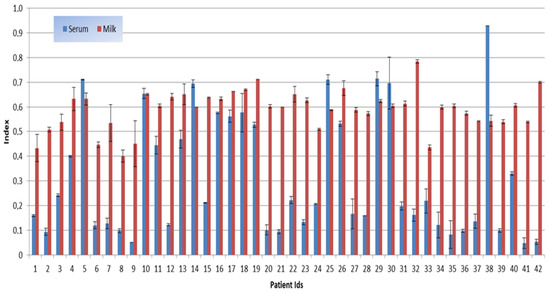 An OD of the sample/OD of the cut-off index >1.4 showed that the sample presented neutralizing antibodies against SARS-CoV-2. An index between 1.2–1.4 indicated an uncertain result. An index <1.2 proved that no IgA antibodies against SARS-CoV-2 were observed in the sample. The test has been experimented and approved by the company for serum [3]. The test has been internally validated for milk. Preliminary testing was performed using milk from lactating women with a past infection of COVID-19 and milk from lactating healthy women (with no documented history of SARS-CoV-2 infection and negative swab prior to collection). All the samples were defatted by centrifugation and skim milk was harvested between the fat layer and the pellet. Different dilutions of the samples were tested. Results confirmed the presence of neutralizing antibodies in the milk of lactating COVID-19 women.