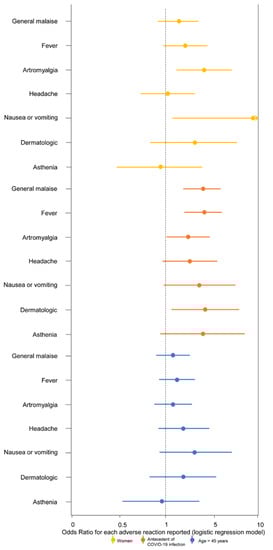 Third, multivariate logistic regression models were designed, and odds ratio (OR) for the development of adverse reactions were calculated. Models were adjusted for sex, age, antecedent of COVID-19, and vaccination doses.