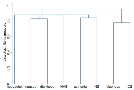 Dendrogram for cluster analysis of adverse reactions to BNT162b2 vaccine. The strongest relationships between the symptoms are marked by lower links on the y-axis. NVS, neurovegetative symptoms; NS, neurological symptoms; CS, catarrhal symptoms.