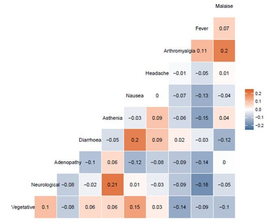 Arthromyalgia and general malaise, nausea and diarrhea (both digestive symptoms), and neurological symptoms and asthenia were the only associations that showed a correlation R > 0.20. Neurovegetative symptoms and nausea also showed a correlation of R = 0.15, as nausea can also be part of a neurovegetative reaction. Finally, an inverse correlation was observed between neurological symptoms and fever (R = −0.18) and asthenia and fever (−0.15). In fact, the presence of fever was inversely correlated with the presence of the remaining symptoms, except for arthromyalgia. The other associations showed no relevant correlations (−0.15 < R < 0.15).