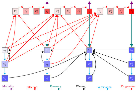 Schematic of the model for one age group. Here, , , , and (purple shaded boxes) represent susceptible individuals who are immunologically naive, have some, moderate, and full immunity, respectively. , , and (red boxes) represent infected individuals with mild, moderate and severe symptoms, respectively, who will develop some, moderate, and full immunity once recovered (teal solid line), respectively. represent vaccinated individuals from the classes () after doses of vaccine given a two-dose schedule. represent exposed individuals (infected, asymptomatic, not infectious) with progressive stages that will experience mild , moderate , and severe symptoms. Susceptible and vaccinated individuals can be infected and move to the exposed classes (red lines). Susceptible and vaccinated classes at the same location on the immunity continuum have similar characteristics. Immunity gained from infection and vaccination can wane (black lines). The bottom of the figure lists all the legends.