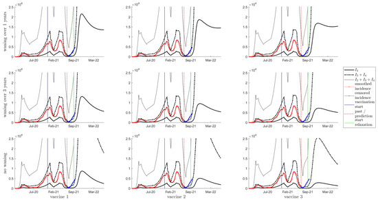 Daily Incidence, with a relaxation of starting in September 2021. Showing daily incidence of (solid line), (dashed line) and (dotted line). Smoothed incidence data is shown with a solid red line. The vertical blue, red and green lines indicate the start of vaccination, the beginning of the prediction phase, the start of relaxation, respectively. The top row is waning of immunity by one year between consecutive classes; the middle row is waning of immunity of three years; the bottom row is no waning of immunity. Columns left to right represent vaccines 1 to 3, respectively.