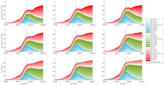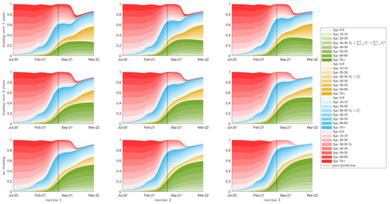 Seroprevalence, with a relaxation of starting in September 2021. Showing seroprevalence as a percent of the total population for 10 year age classes, with colour intensity corresponding to age class. The red region is the sum of a susceptible classes that have been exposed to the virus, either from natural infection or through waning from the vaccinated classes. The blue and green regions show the populations of the first and second dose vaccinated classes respectively. The total population with some immunity (the top of the red region) is equal to the vertical sum of the three Blue, Red, and Green regions. The top row is waning of immunity by one year between consecutive classes; the middle row is waning of immunity of three years; the bottom row is no waning of immunity. Columns left to right represent vaccines 1 to 3, respectively. The vertical bar denotes the beginning of the prediction phase.