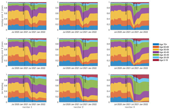 Distribution of Immunity, with a relaxation of starting in September 2021. Showing immune status of uninfected individuals as a percent of the total population for 10 year age classes, with colour intensity corresponding to age class. The colours represent the immunity of the population from green, the fully immune population, through yellow and blue to red, the fully susceptible population. The top row is waning of immunity by one year between consecutive classes; the middle row is waning of immunity of three years; the bottom row is no waning of immunity. Columns left to right represent vaccines 1 to 3, respectively. The vertical bar denotes the beginning of the prediction phase.