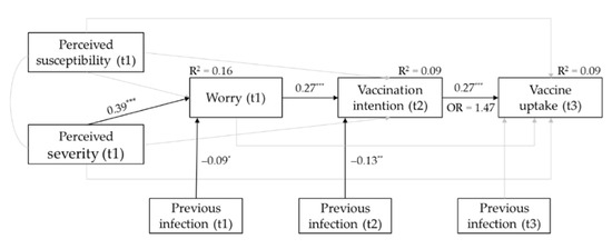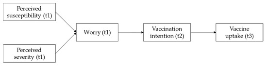 The results of the correlation analyses (see Table 1) show that perceived severity, but not perceived susceptibility, at t1 was significantly positively related to worry at t1 and vaccination uptake at t3. Additionally, worry at t2 was (marginally) significantly positively associated with vaccination intention at t2 and vaccination uptake at t3. Finally, a significant positive correlation was found between vaccination intention at t2 and vaccination uptake at t3.