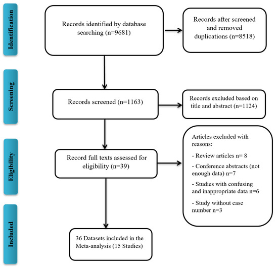 A total of 9681 publications were screened for COVID-19 VE against the Delta variant, of which 15 studies, all written in English, were included in the meta-analysis (Figure 1). Characteristics of the included publications are summarized in Table 1. A total of 15 studies (36 datasets) were included in the meta-analysis. Studies that reported different vaccine dose efficacies were considered as a separate dataset for the meta-analysis. A total of 10 datasets reported the VE against the Delta variant after the first dose, 23 datasets after the second dose, and 3 datasets after the third dose. Out of 36 datasets, 16 datasets reported the Pfizer-BioNTech VE, 8 that of AstraZeneca, 5 that of Moderna, 2 that of mRNA vaccines (Pfizer/Moderna), 3 that of CoronaVac, 1 that of Pfizer/Moderna/J&J, and 1 that of Bharat Biotech VE. All included studies were reported during the 2021 publication year. Begg’s test (p = 0.37) and Egger’s test (p = 0.47) did not detect significant publication bias.