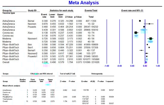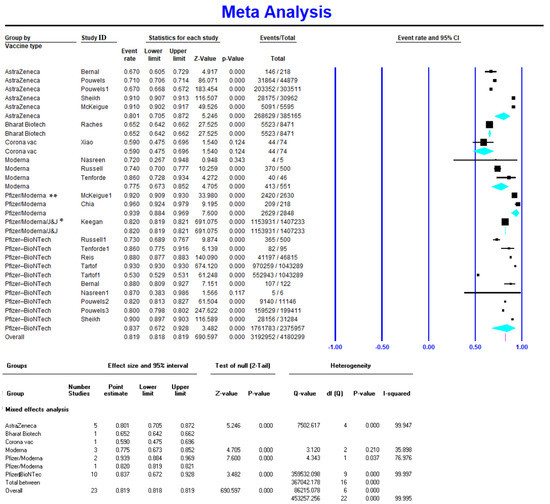 All extracted data were initially cleaned and prepared for analysis via Microsoft Office 365, and analysis was performed by Comprehensive Meta-Analysis Software Version 2.0. The point estimates of the effect size and 95% confidence interval (95% CI) were calculated for estimating VE. The VE prediction in the included studies is explained in the Supplementary Materials. Random effects models were used to estimate pooled effects. Additionally, to search for heterogeneity between studies, the I2 statistic was used, and high heterogeneity was characterized as an I2 > 50%, with sources of heterogeneity established through meta-regression and subgroup analyses. For all analyses, two-tailed statistics and a significance level of less than 0.05 were considered. Begg’s test and Egger’s test were conducted for the detection of publication bias.