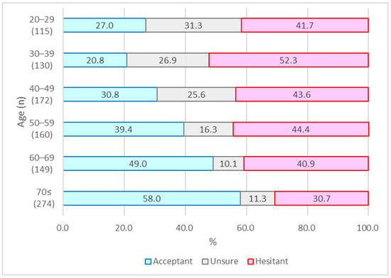 Thus, vaccine hesitancy varies greatly depending on time and circumstances. However, it seems that vaccine acceptance among the Japanese has been on the rise. In fact, as of November 2021, the vaccination rate with one or more doses had reached 79%, the highest among the G7 countries [21]. In Japan, there were concerns that vaccine hesitancy was likely to be high [9,10]; however, this was not found to be the case, and the actual COVID-19 vaccination rate was higher than expected. Therefore, it is very important to explore the factors associated with these changes.