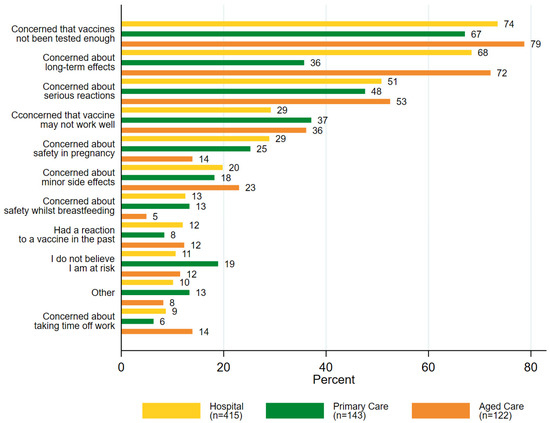 Of those HCWs who were unsure or not intending to accept a COVID-19 vaccine (n = 680), the primary concern across all settings was the belief that the vaccines have not been tested enough for safety (73%, 497/680). While concern about potential long-term effects of the vaccine was the next most common concern in hospital (68%, 284/415) and aged care settings (72%, 88/122), primary care HCWs were more concerned about serious reactions (48%, 68/143) (Figure 3 and Table S3).