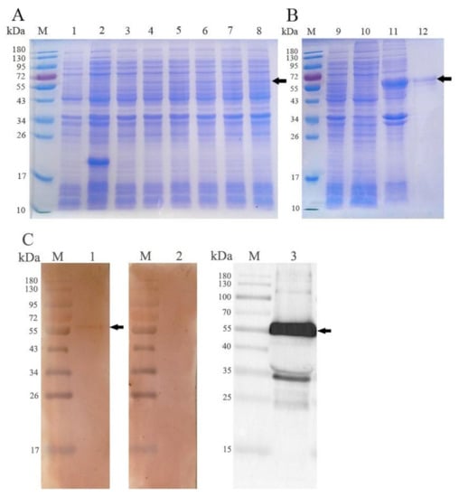 The rEmROM5 was expressed in E. coli and was analyzed through WB analysis. As shown in Figure 2, the expression of rEmROM5 was positively correlated with the induction time (Figure 2A, Lane 4–8). The expressed rEmROM5 was mainly distributed in the inclusion bodies of the host bacteria (Figure 2B, Lane 11). After purification, SDS-PAGE showed a single protein band close to 53.64 kDa, which is consistent with the total molecular weight of the ntmEmROM5 protein (35.31 kDa) and pET-32a tag protein (18.33 kDa) (Figure 2B, Lane 12). WB analysis showed that rEmROM5 was recognized by His-Tag Mouse Monoclonal antibody (Figure 2C, Lane 3) and chicken serum against E. maxima (Figure 2C, Lane 1) separately. Meanwhile, rEmROM5 was not recognized by the negative serum (Figure 2C, Lane 2). The original images for Figure 2C are shown in Figures S1–S3.