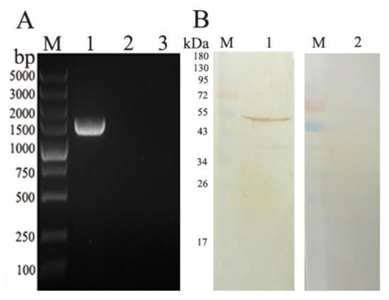 RT-PCR was used to detect the transcription of the EmROM5 gene in the injection site muscles of the chickens. In Figure 3A, a DNA band of approximately 1461 bp was detected from the pVAX–EmROM5-injected muscles (Figure 3A, Lane 1), and there were no bands in the samples of the pVAX l.0-injected muscles and non-injected muscles (Figure 3A, Lanes 2 and 3). WB analysis was used to detect EmROM5 gene expression in the injected muscles. As per the results in Figure 3B, a protein band of 53.57 kDa that is consistent with the molecular weight of the EmROM5 protein was detected from the pVAX–EmROM5-injected muscles (Figure 3B, Lane 1), and no bands are visible for the negative control (Figure 3B, Lane 2). These results indicate that successful pVAX–EmROM5 transcription and expression of occurred in the injected muscles. The original images for Figure 3B are shown in Figure S4 and Figure S5.