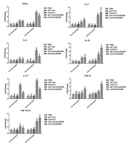 Changes in mRNA transcription of cytokines in splenic lymphocytes following the immunization of rEmROM5 and pVAX-EmROM5 (n = 5, value = mean ± SD). Significant difference (p < 0.05) between numbers with different letters, and no significant difference (p > 0.05) between numbers with the same letter.