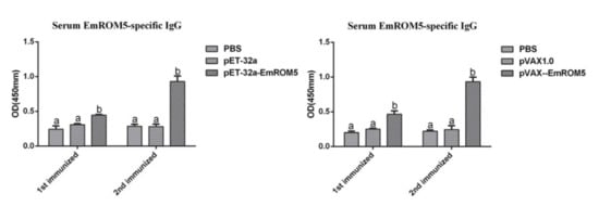 There were five groups of fourteen-day-old chickens with similar weights. Experimental group chickens were vaccinated with 200 μg of rEmROM5 or 100 μg of pVAX–EmROM5 by injecting into the leg muscles, respectively. Control group chickens were injected with the pET-32a tag protein, pVAX1.0 plasmid, or PBS, respectively. After seven days, a booster immunization was performed using the same procedure.