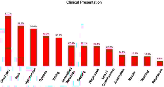 Clinical presentation of patients with Kounis syndrome according to symptom prevalence.