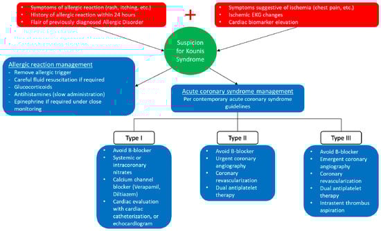 The management of ACS in the acute phase should follow the existing guideline recommendations primarily based on electrocardiographic criteria, since no specific recommendations are currently available [27,28]. In our review, we found that aspirin was prescribed to 41.2% of patients and dual antiplatelet therapy was only initiated in patients requiring stent placement. Beta blockers should be avoided given the possibility for worsening coronary vasospasm due to uncontested α-adrenergic activity [29]. In the Type I variant of KS, for which coronary vasospasm is the primary pathophysiologic mechanism for coronary hypoperfusion, systemic or intracoronary nitrates as well as calcium channel blockers, such as diltiazem and verapamil, were frequently utilized and appear to be an acceptable treatment options for such patients. Though, it is important to highlight the need for close hemodynamic monitoring since they may dangerously lower the blood pressure in the context of an allergic reaction. This is further supported by our finding of hypotension on admission of approximately half the included patients. These medications were also continued at discharge for a considerable number of patients but evidence on long-term outcomes and complications for patients presenting with KS is currently scarce even though cases of recurrent disease have previously been described [30]. Based on our findings, an algorithm for optimal management of patients with KS is proposed in Figure 3.