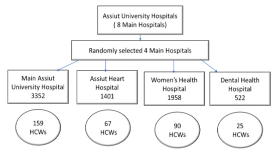 Sample size calculation was carried out using the EPI Info 2000 statistical package. The calculation was based on an expected frequency for acceptance among Egyptian healthcare workers to the COVD-19 vaccine (21%) [3] during a COVID-19 attack, with a difference of 5% and a confidence interval of 95%. The minimum required sample was 255. The sample was raised to 341 HCWs to compensate for refusals and incomplete data. The sampling technique was multistage, where in the first stage there was a simple random sampling so to choose 4 hospitals from 8 hospitals, i.e., a sample in each hospital was proportionate to the size of the number of HCWs working in it (the total in 4 hospitals was 7233, where the main hospital represented 46% of the total, and we took 159 HCWs, which represented the same percentage from the total sample). Then, in each hospital a convenience sampling technique was applied, as all HCWs had same call and chance for obtaining their vaccine (Figure 1). A questionnaire was applied via the interview method.