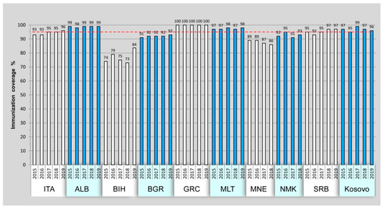 Our vaccination coverage data highlighted some critical aspects: four countries (Bosnia and Herzegovina, Bulgaria, Montenegro, and North Macedonia) showed immunization under the reference value of 95% during the study period. In addition, it is very likely that the coverage values have dropped even more in 2020, in all countries, due to the COVID-19 pandemic.