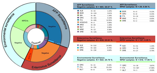 A total of 794 non-polio enteroviruses (NPEVs) were identified in samples collected through AFP, enterovirus and environmental surveillance. Most of the NPEVs were identified in Italy through environmental surveillance (N = 587; 17.08%) followed by those isolated in Albania (N = 41; 1.19%), Greece (N = 79; 2.30%), and Serbia (N = 27; 0.79%) during enterovirus surveillance activities. Fewer NPEVs were isolated in the context of AFP surveillance (Figure 3).
