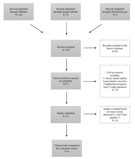 Eighty-three articles were excluded based on the abstract, representing literature reviews. From the remaining 37 articles, 24 articles were excluded at this stage: 11 studies were mouse model-based, 9 studies were not addressing the study question, 2 studies were regarding the preventative vaccines, and 2 studies included additional oncogenes in the development of therapeutic vaccines. We included 6 studies performed between 2003 and 2017 in our systematic review after the exclusion of 7 articles studying the effects of therapeutic vaccines with either viral, bacterial, or peptide vectors [12,13,14,15,16,17]. These six studies represented the work completed in the United States of America, Korea, Estonia, South Africa, India, Canada, Australia, and Georgia [12,13,14,15,16,17] (Table 1).