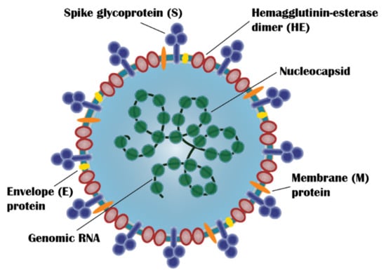 Schematic drawing of SARS-CoV-2 representing the major virus components: spike glycoprotein (S), hemagglutinin-esterase dimer (HE), membrane protein (M), envelope protein (E), nucleocapsid, and genomic RNA. (Redrawn by the authors based on Figure 2 in Ref. [13]).