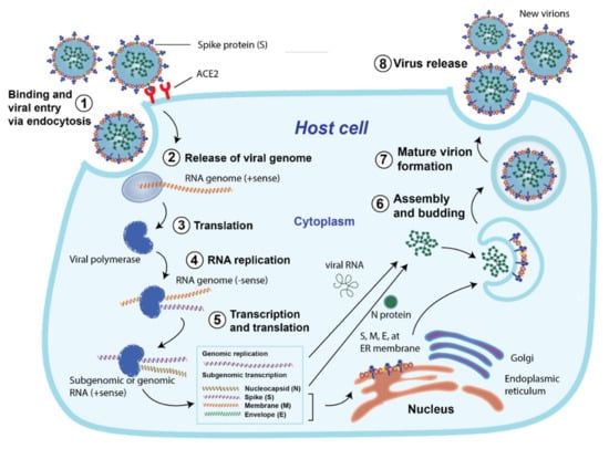 SARS CoV-2 life cycle: (1) Binding and viral entry to the host cell via endocytosis; (2) release of viral genome; (3) translation and (4) replication of RNA genome; (5) transcription and translation of RNA into protein; (6) assembly and budding, followed by (7) mature virion formation; and (8) release of the new virion from the host cell. (Redrawn by the authors based on second figure in Ref. [22]).